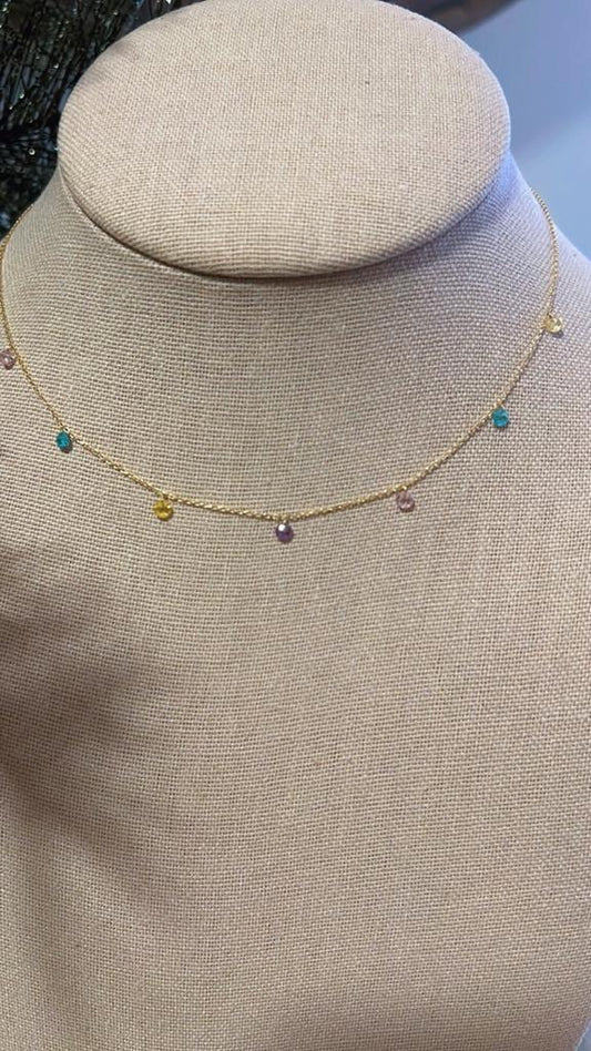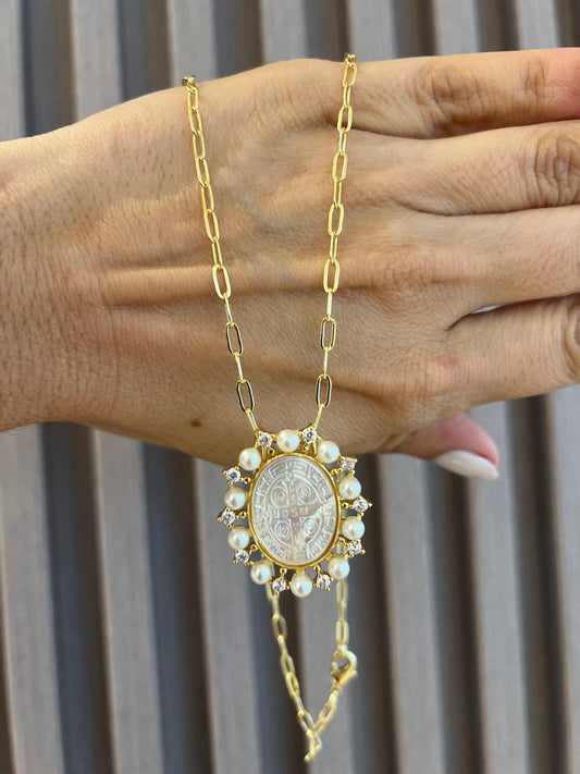 Cuello paper click con medalla religiosa, perlas y Cz rodinado Gold