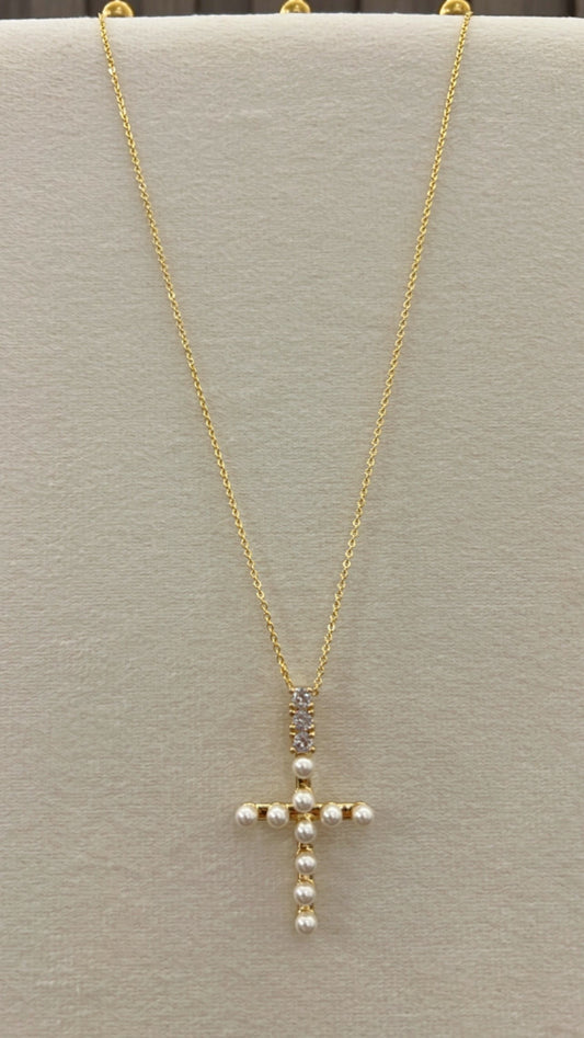 Cuello Cruz con detalles de perlas y Cz rodinado Gold